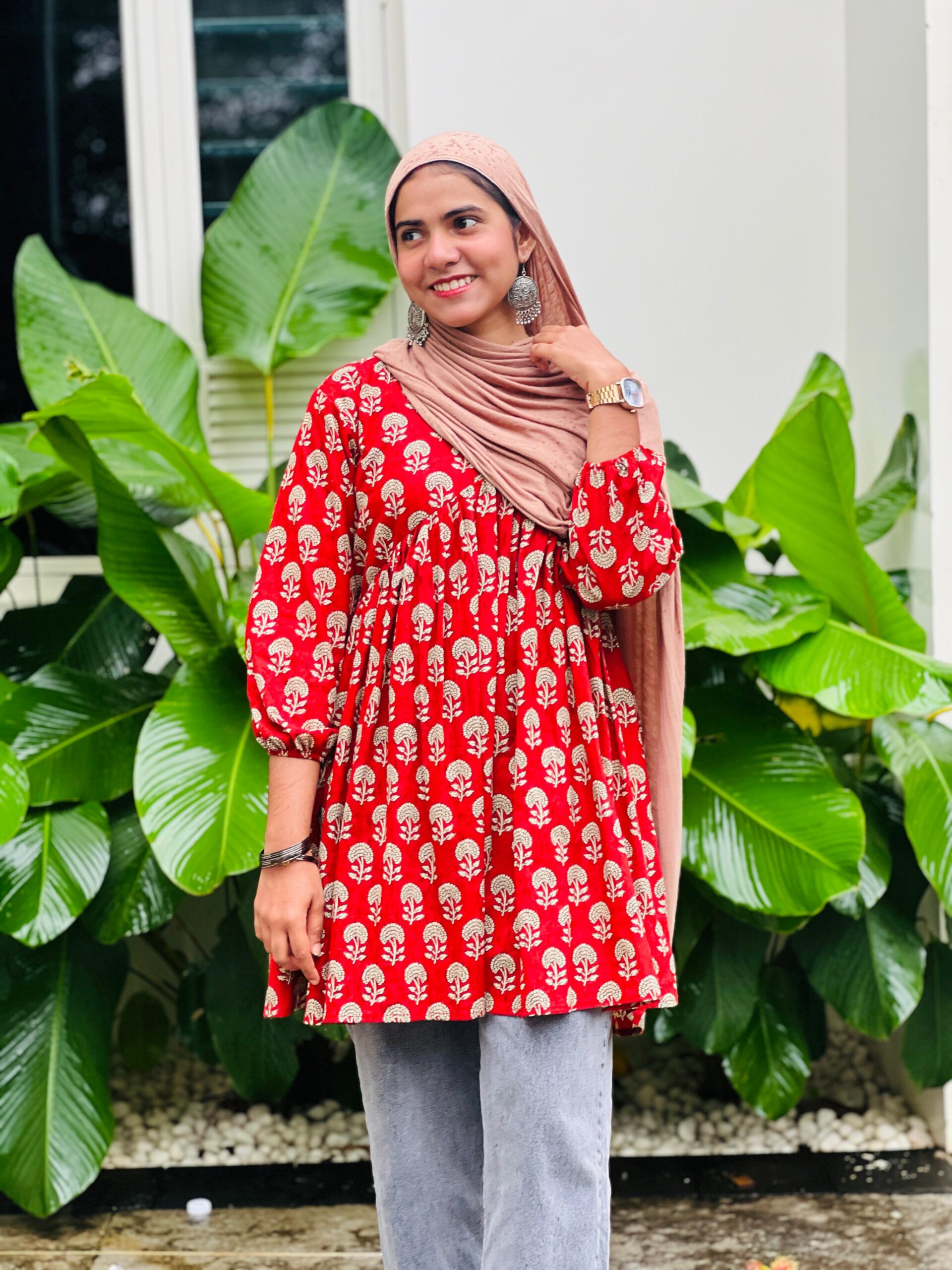Red Cotton Short Kurti featuring soft breathable cotton fabric and elegant block prints for all-day comfort.